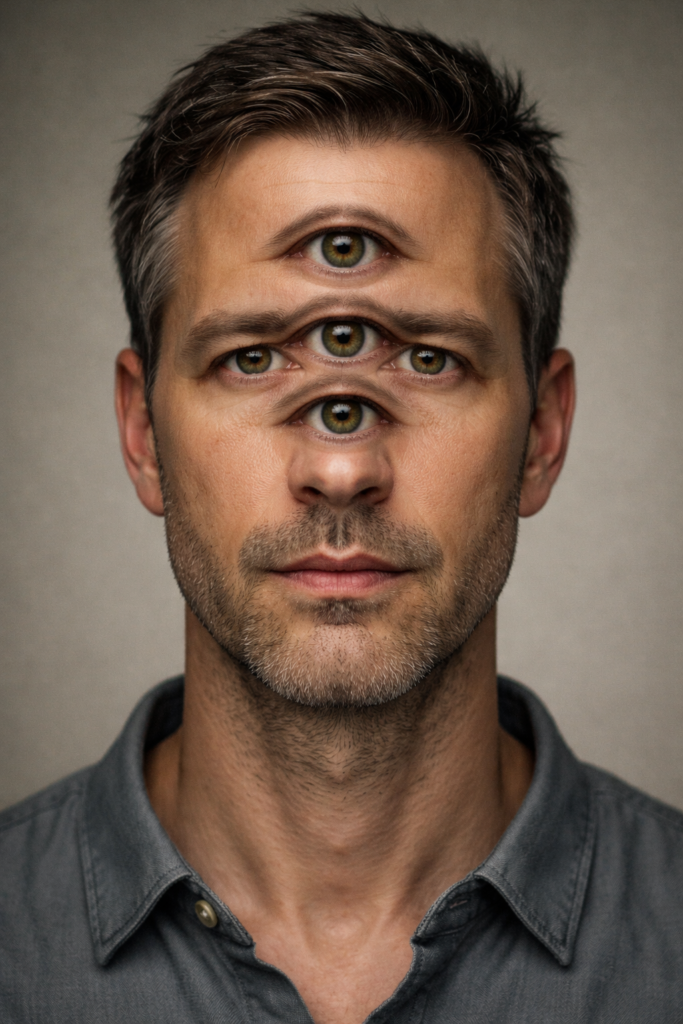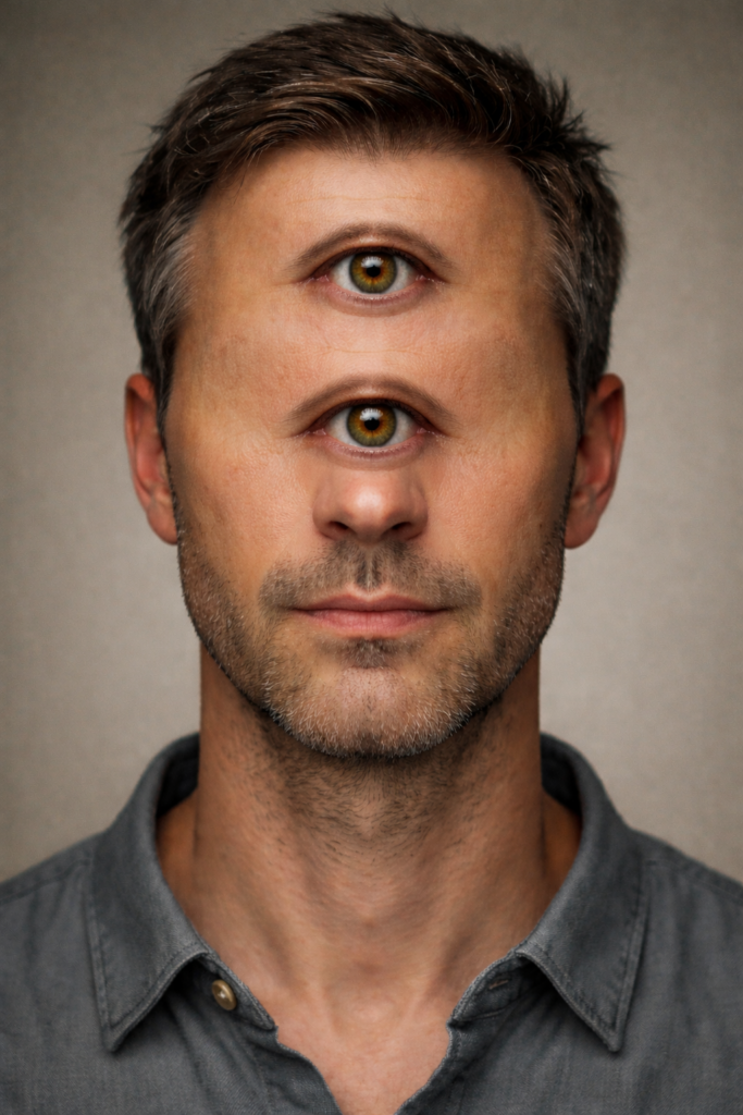 “A man’s face with no horizontally aligned eyes anywhere on the face. Exactly two eyes total, stacked vertically along the facial midline.”